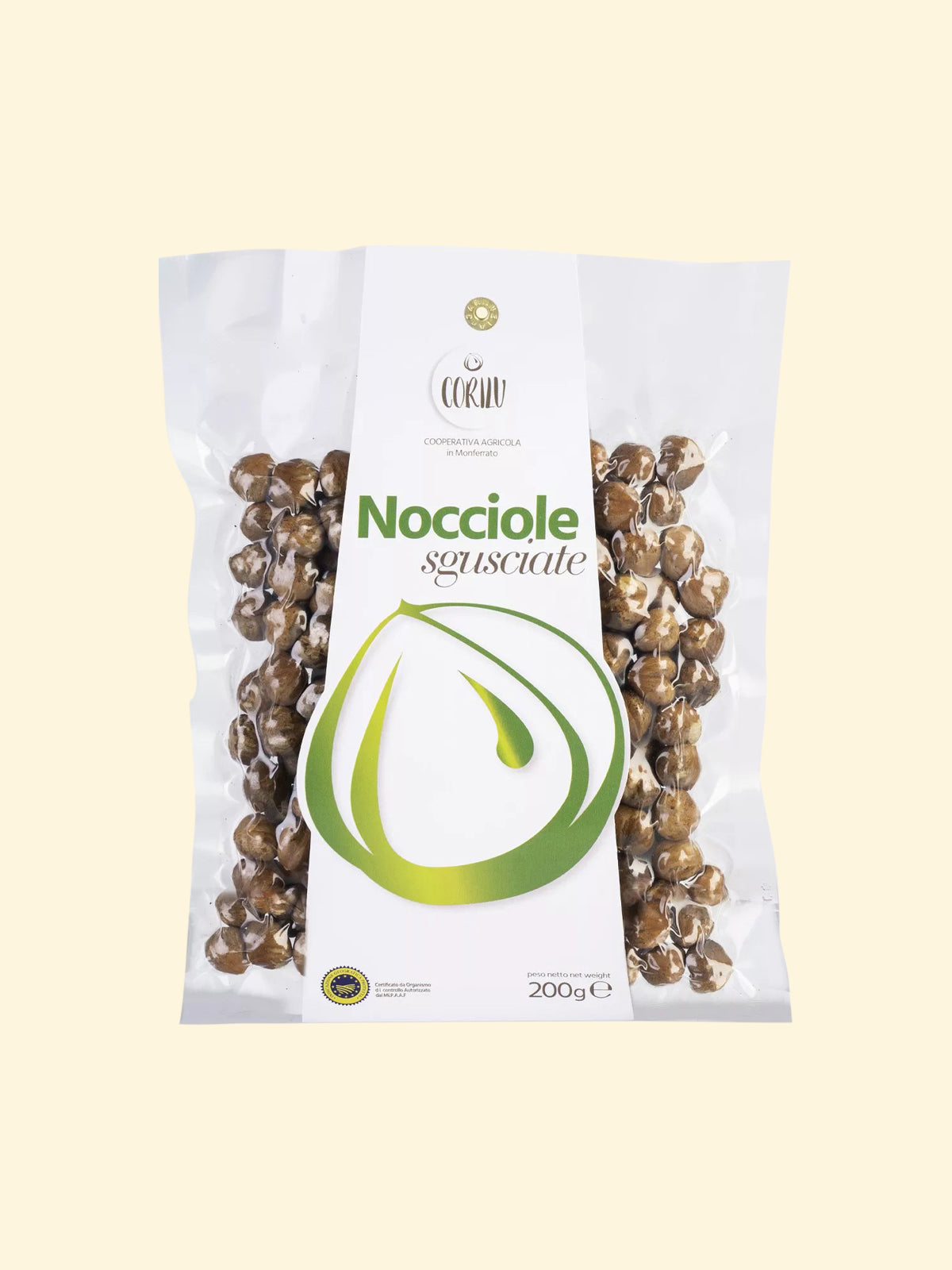 Naturlig Piemonte IGP hasselnöt skalad och noggrant utvald i vakuumförpackning. Färsk som nyss plockad från åkern och skalad.