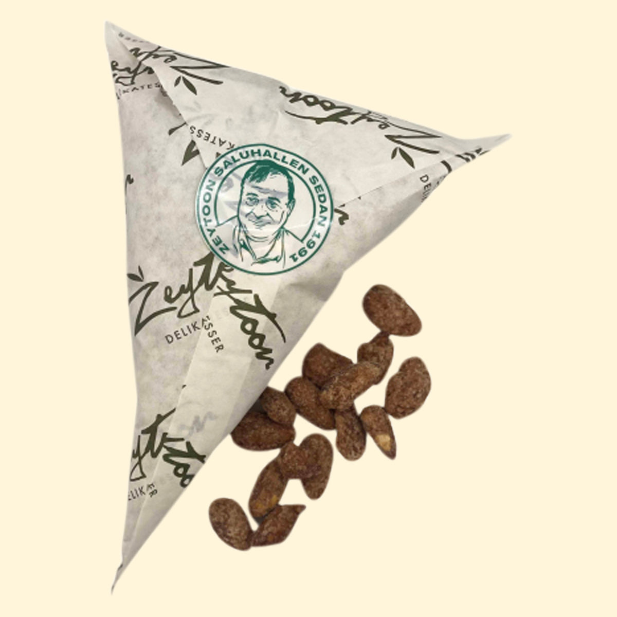 Våra amerikanska mandlar kanderar vi flera gånger i veckan i vårt rosteri inne i Stora Saluhallen. Ett klassikt recept med vanilj, kanel och socker. Vi skickar nötterna varma i nötstruten.