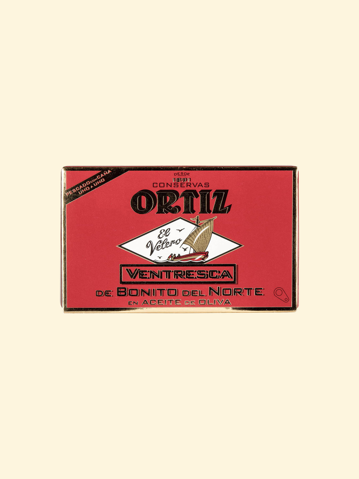 Filéer av vit tonfisk i extra jungfruolivoljaVentresca kallas den del på den vita tonfisken (Bonito del Norte) som är absolut finast, den är mild i smaken och väldigt mör. Ventresca från Ortiz görs endast på hela filéer från tonfiskens mage, dessa packas i olivolja, steriliseras och konserveras. God i sig själv tillsammans med en brödbit och hemslagen majonnäs, vänd gärna ner olivoljespadet i majonnäsen för en tydligare tonfisksmak. Gott även till exklusivare tonfisksallad eller “Ensaladilla Rusa”. Conservas Ortiz arbetar hårt för att bygga upp en trovärdighet kring fångsten. Man vill ha ett hållbart fiske men det finns problem i fiskesektorn. Conservas Ortiz arbetar aktivt för att man även i framtiden ska kunna få en förnyelse av de arter de fångar. Samtidigt är man mån om att inte skada andra arter under dagens arbete. Man använder därför traditionella metoder vid fångst som fiskespö för att fånga tonfisk och nät för att fånga sardeller. Båda är bl. a delfinsäkra.