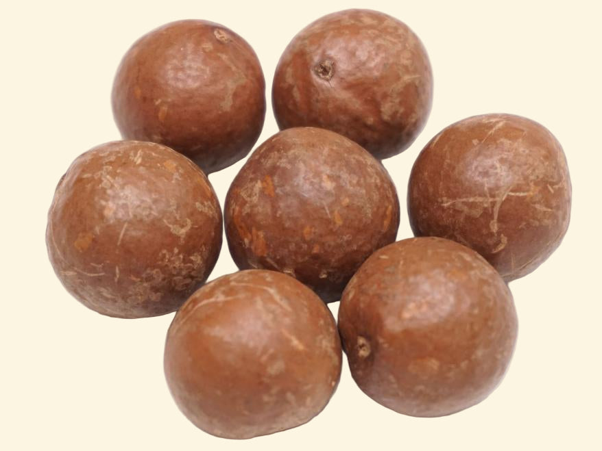 Makadamianöten är en av världens mest exklusiva nötter, och i svenskt sortiment är den nästan omöjlig att hitta med skalet kvar. Det tjocka, stenhårda skalet gör den i princip omöjlig att knäcka utan specialverktyg – men just därför är den också något alldeles extra.