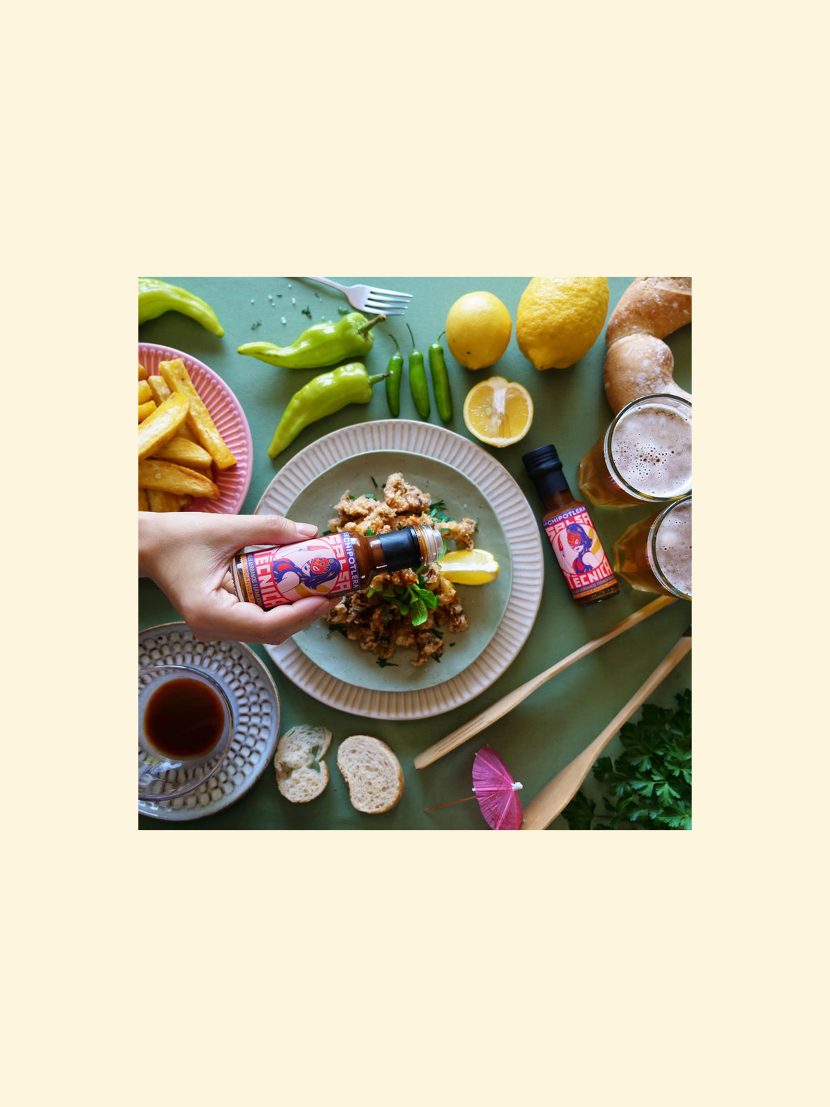 Äppelcidervinäger*, serranochili*, moritachili*, vattenchili*, hibiskusblomma*, kryddpeppar*, aromatiska örter*, jungfrusalt.