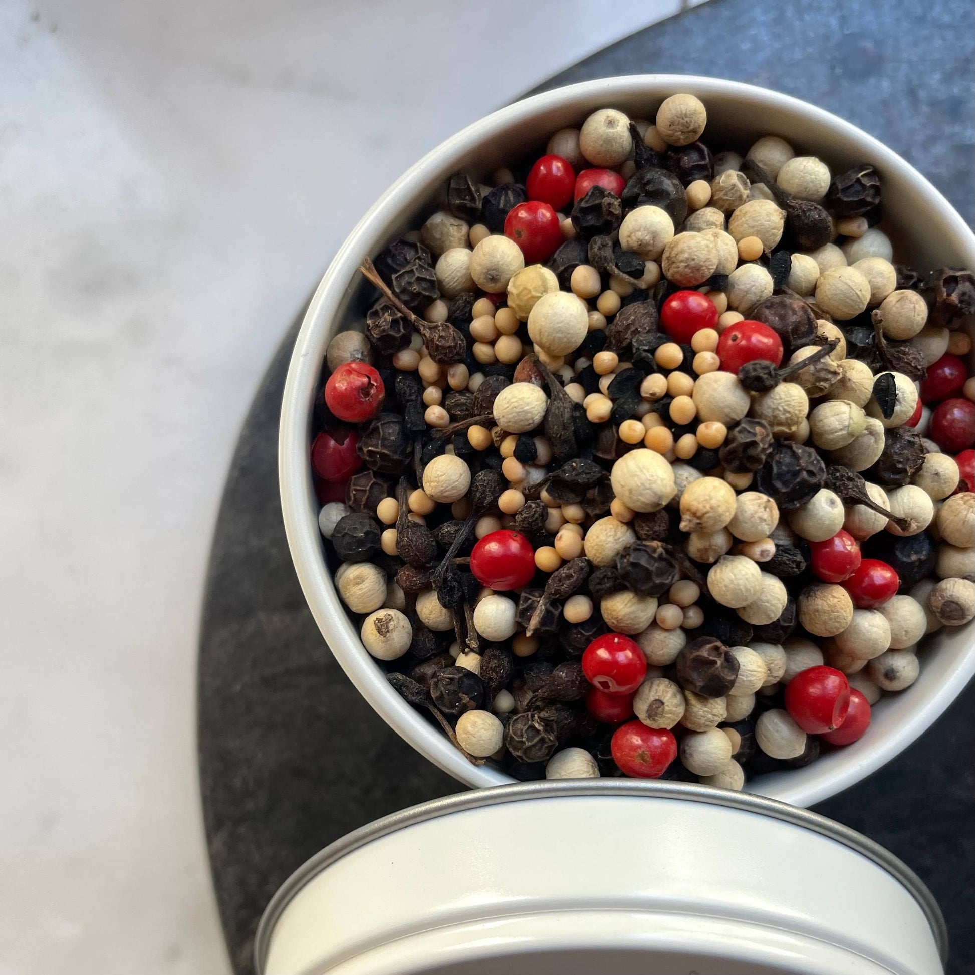 Svartpeppar, vitpeppar, svart vildpeppar, senapsfrön, rosa bär och nigella.