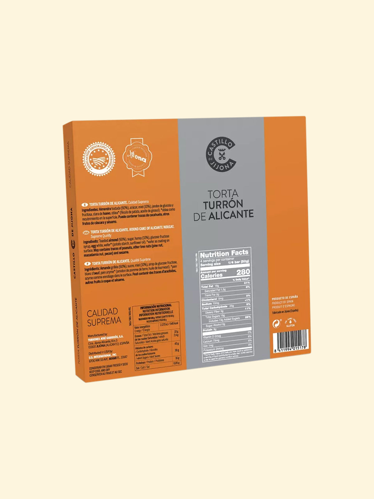Vår Alicante Nougatkaka från Castillo de Jijona är resultatet av en expertkombination av noggrant utvalda ingredienser. Denna skapelse är en fröjd för älskare av traditionella smaker. Denna traditionella krispiga dessert gjord på mandlar fångar själva essensen av Alicantes rika kulinariska arv. Varje tugga kommer att transportera dig till de soliga Medelhavsländerna, där den perfekta kombinationen av rostade mandlar och honung smälter samman för att skapa en unik upplevelse. Denna traditionella sötsak är en klassiker och en av husets specialiteter. Vår Alicante Nougatkaka är resultatet av förstklassigt kulinariskt hantverk. Dess unika presentation och balans mellan ingredienserna gör denna produkt till en fröjd som kommer att transportera dig till essensen av traditionella smaker. Njut av äktheten och kvaliteten hos Castillo de Jijona med vår Alicante Nougatkaka, en delikatess som utmärker sig för sin harmoniska blandning av högkvalitativa ingredienser.